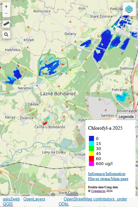 Přidán model pro snímek z 12.8.2025. prakticky bez oblačnosti. Po nějaké době máme dva téměř bezoblačné snímky pokrývající celé sledované území a z nich vytvořené modely méně než týden po sobě. Někde za tu dobu prakticky nenastala žádná změna, jinde jsou místně změny docela velké - např. rybník Broumar u Opočna se docela výrazně "pročistil", zatímco v třeba v rybníku Rozhrna západně od Bohdanečského rybníka koncentrace chlorofylu-a naopak podobně výrazně narostla. Většina vodních ploch ale zůstává v poměrně setrvalém stavu, včetně písníků oblíbených pro přírodní koupání (např. Hrádcek, Oplatil, Mělice, Opatovický písník, Správčický písník), kde je kvalita vody stále vesměs velmi dobrá až vynikající. Ne ale všude, zejména menší a starší písníky, případně ty, které slouží primárně k chovu ryb, už na tom nejsou nejlépe (např. Velká a Malá Černá, menší Flajšar).