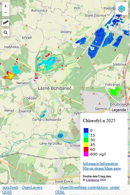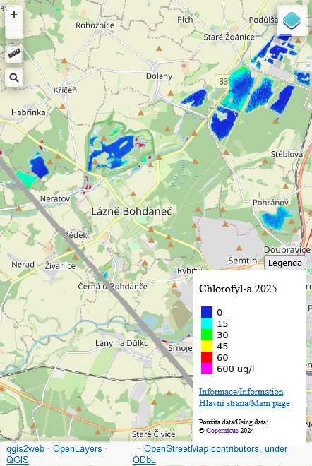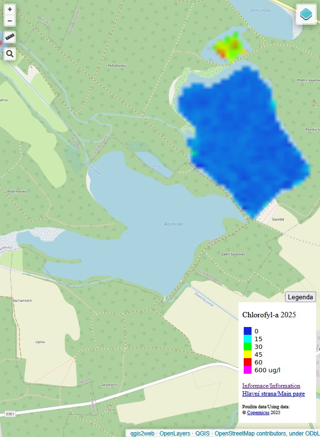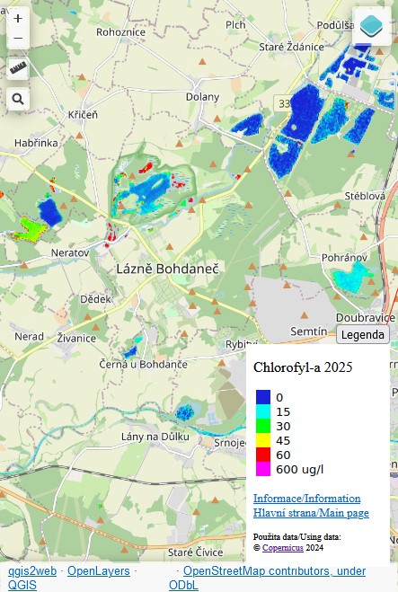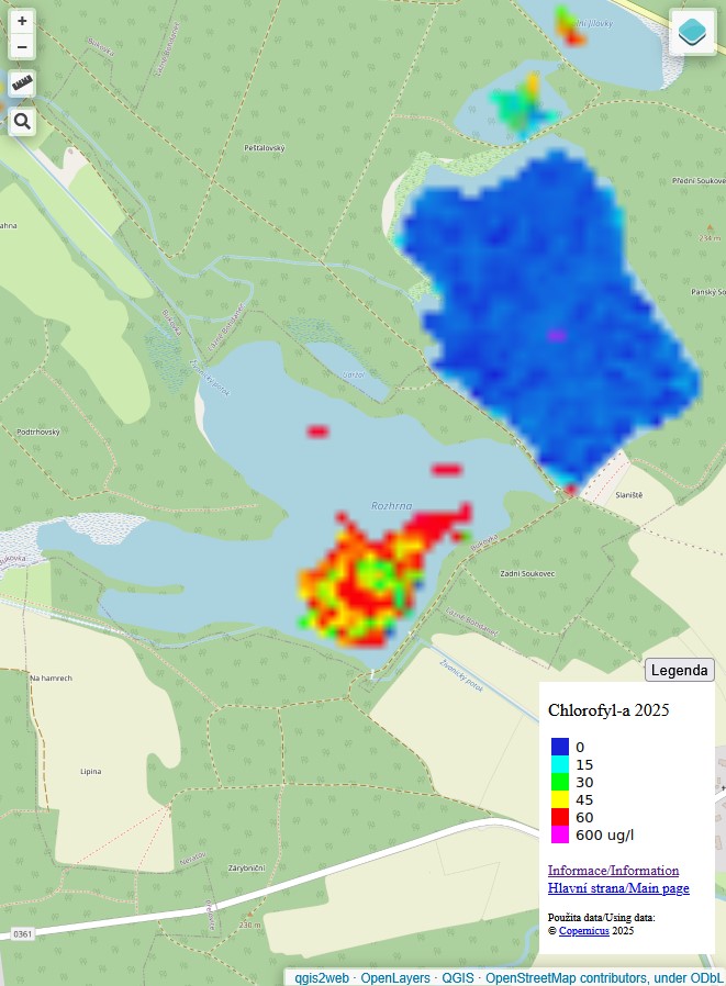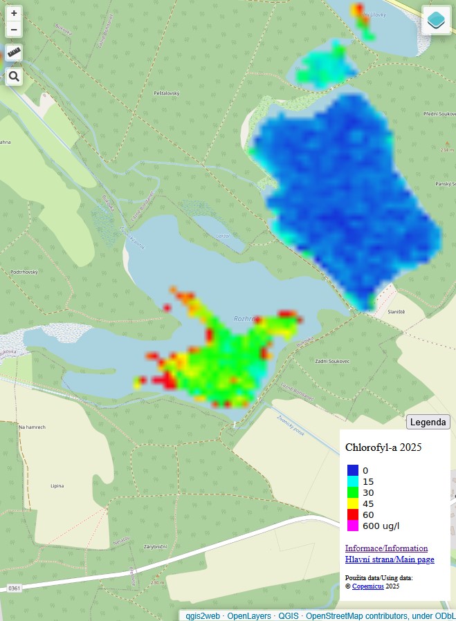 Přidán model pro snímek ze 13.6.2025. Po delší době opět snímek prakicky bez jakýchkoli mraků, takže model pokrývá všech zhruba 2500 vodních ploch viditelných na snímku. Oproti předchozímu modelu jsou hodnoty chlorofylu jen nepatrně zvýšené v písnících, na něketrých rybnících už ale koncetrace dosahují hodnot přes limit III. stupně.